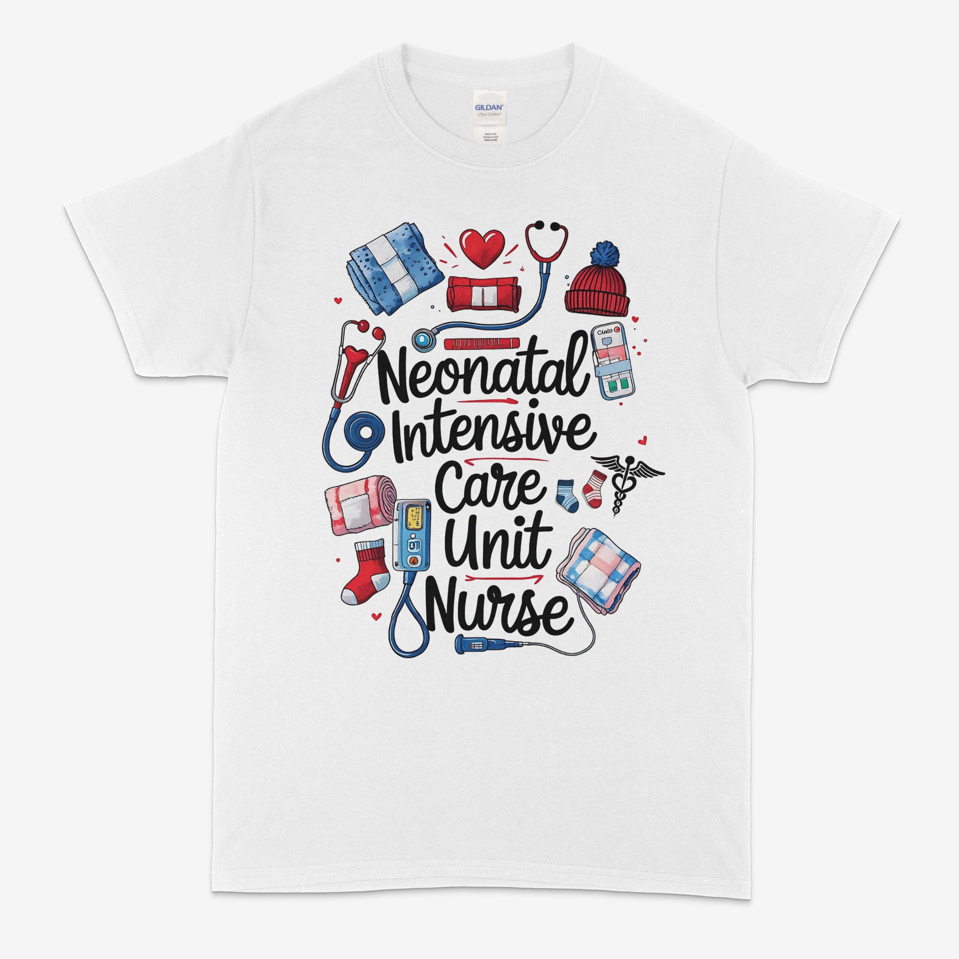 Celebrate the heart of neonatal care with this sweet and meaningful design! Featuring “Neonatal ICU Nurse” in blue and red, paired with baby essentials like hats, blankets, and more, this tee and crewneck are perfect for NICU nurses who dedicate their days to caring for the tiniest patients. Available in a crisp white tee or cozy white crewneck, it’s the perfect blend of comfort and pride.