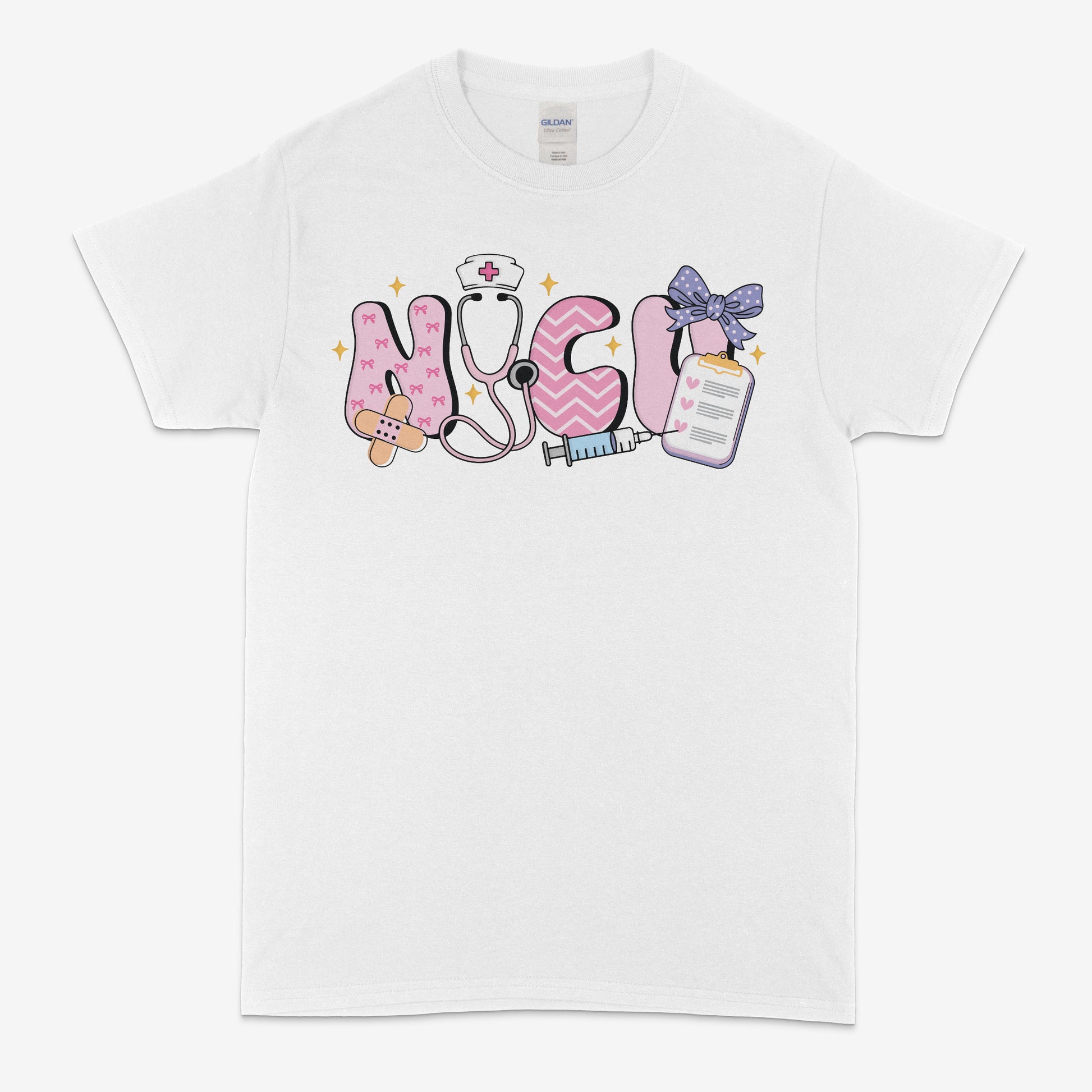 Celebrate the heart of neonatal care with this NICU design featuring nurse essentials like a stethoscope, syringe, and more. Perfect for NICU nurses, nursing students, or anyone proud to represent neonatal care, this tee and crewneck combine comfort with meaning. Available in classic white, it’s simple, stylish, and made to honor the important work you do.