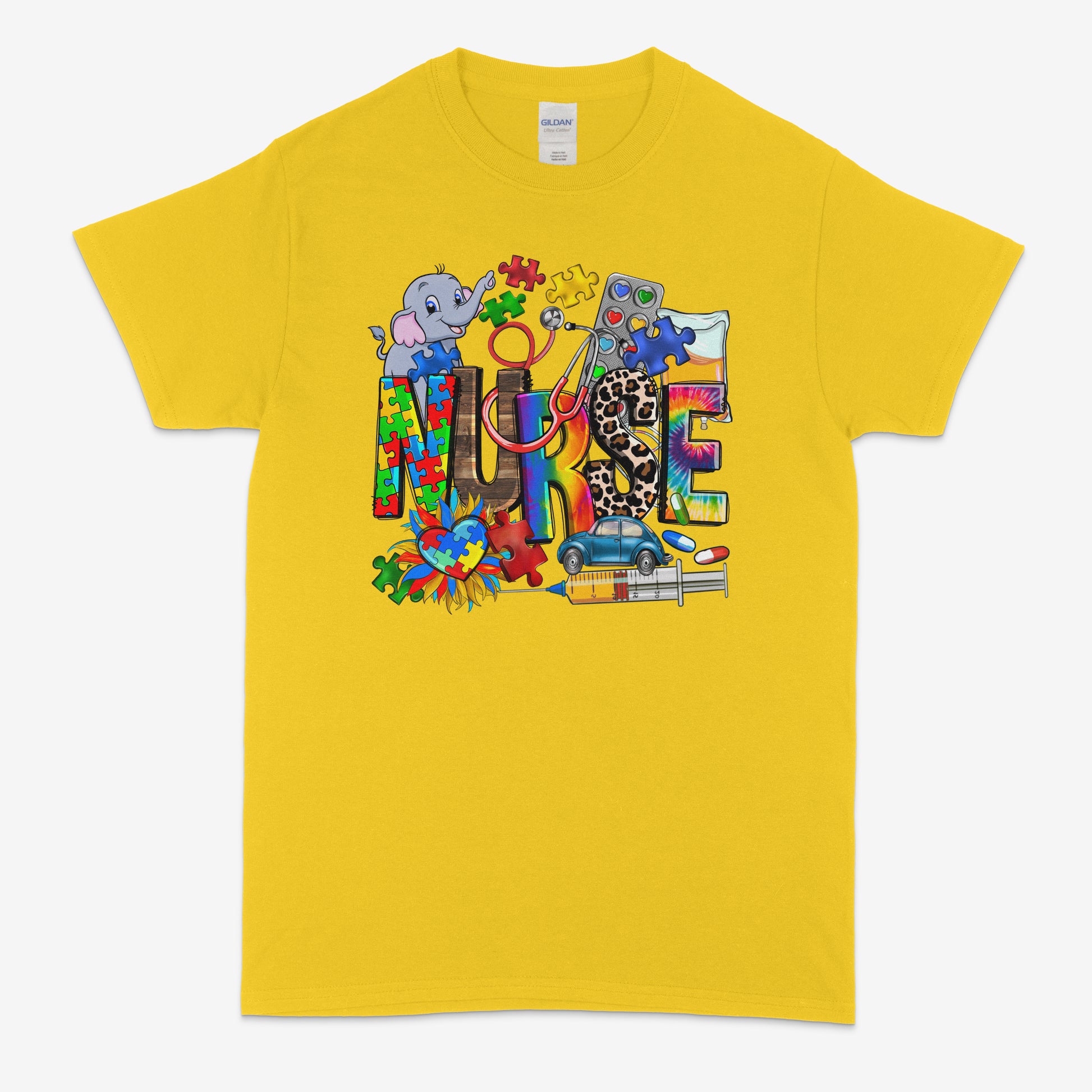 Bright, fun, and full of heart—this design was made for the nurses who bring extra care and joy to little ones and patients with special needs. Featuring playful nurse icons like a stethoscope, elephant, and puzzle pieces, this tee and crewneck perfectly capture the spirit of compassion and positivity. Available in a sunny yellow tee or a clean white crewneck, it’s a cheerful way to show off your nursing pride.